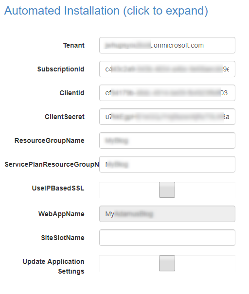 The first page of the site contains the following fields that must be provided by you. You can either fill them out from the site extension or you can set the properties as app settings.