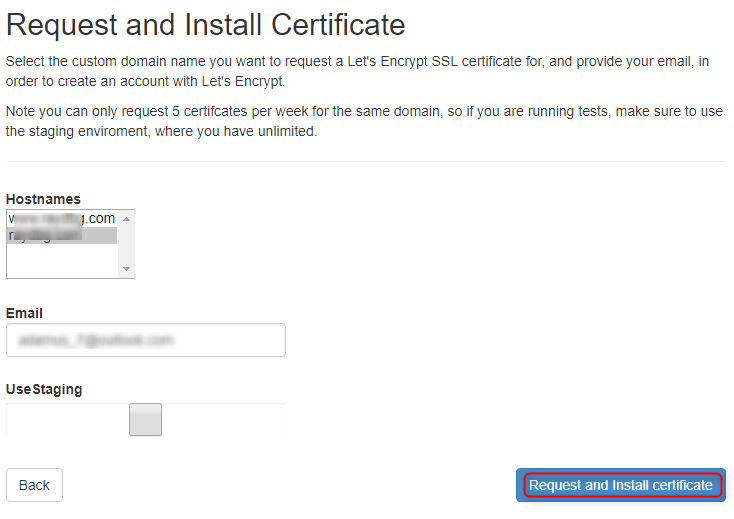 Select which hostname you want to request certificates for and provide your email address.